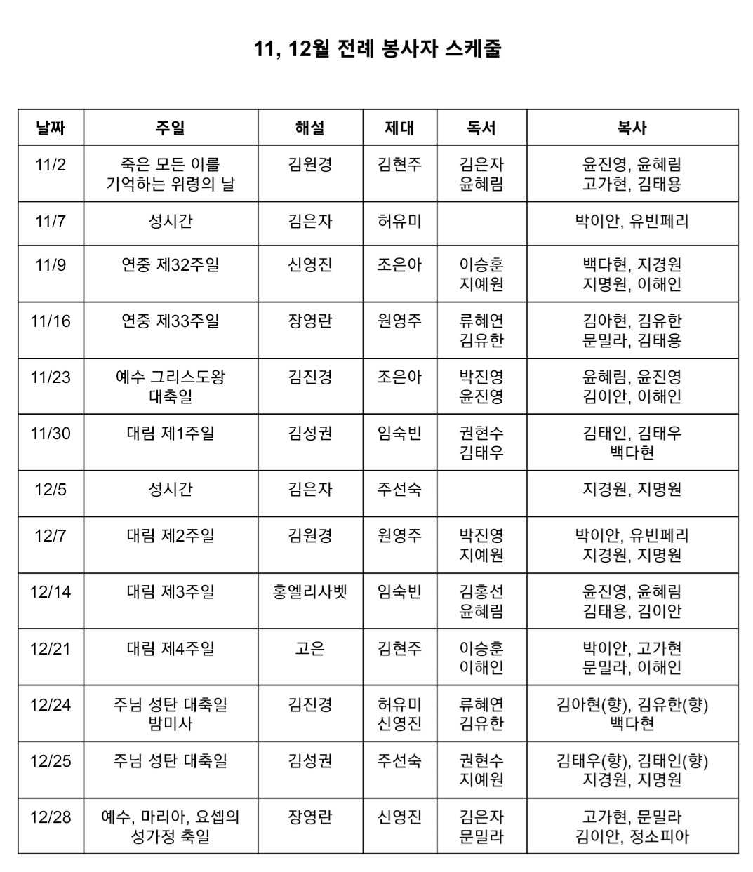 11, 12월 전례 봉사자 스케줄